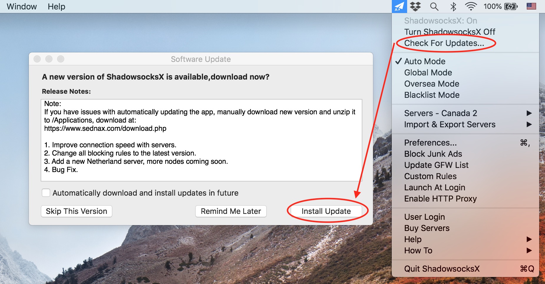 Step 1: Click app icon on top status bar, click menu Check For Updates..., if you are using app downloaded from Mac App Store, you won't see this menu, please jump to step 3 to manually update app.Step 2: Click menu Install Update, and then wait for app to update and reopen automatically.