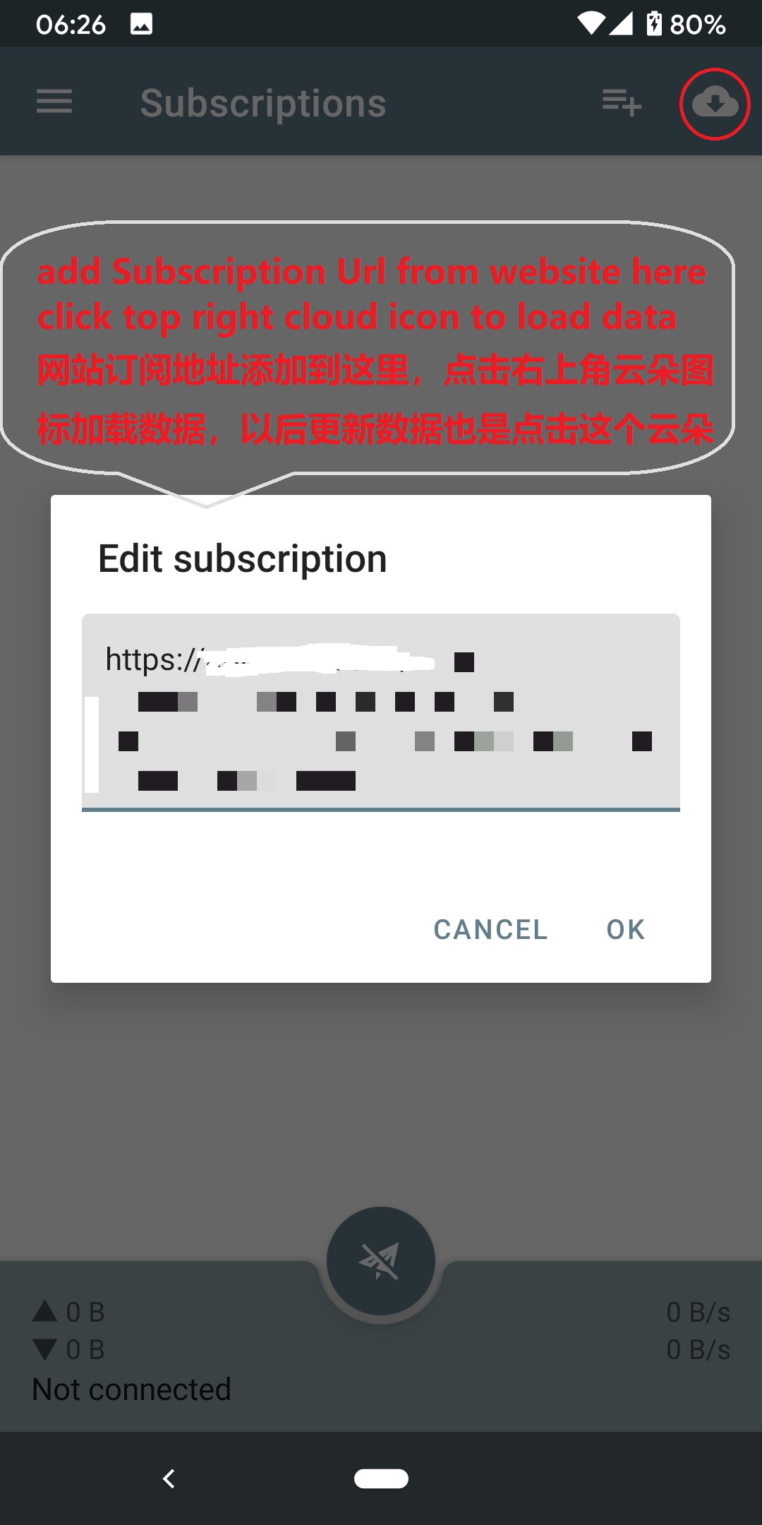 Step 2: After installing, please click top left icon to add Subscription Url, click here to get green subscription url.