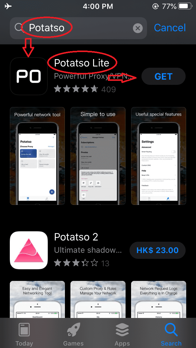 Step 1: Open App Store->Tap top-right icon->Scroll down to bottom to Sign Out-> Scroll to the top-> Then sign in with a non-China Apple ID, Note: You should never sign in your iCloud with this public Apple ID, you don't need to change anything in iCloud.Step 2: After Sign In, open App Store search "Potatso", and then download this appStep 3: After download, please open Potatso and add Subscription Url, click here to get green subscription url.