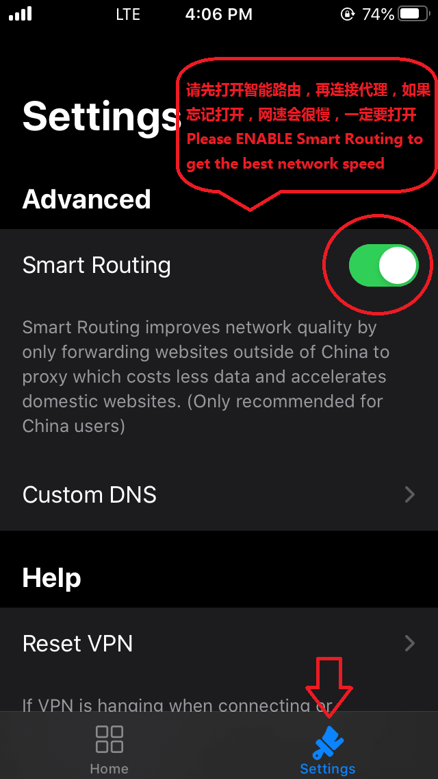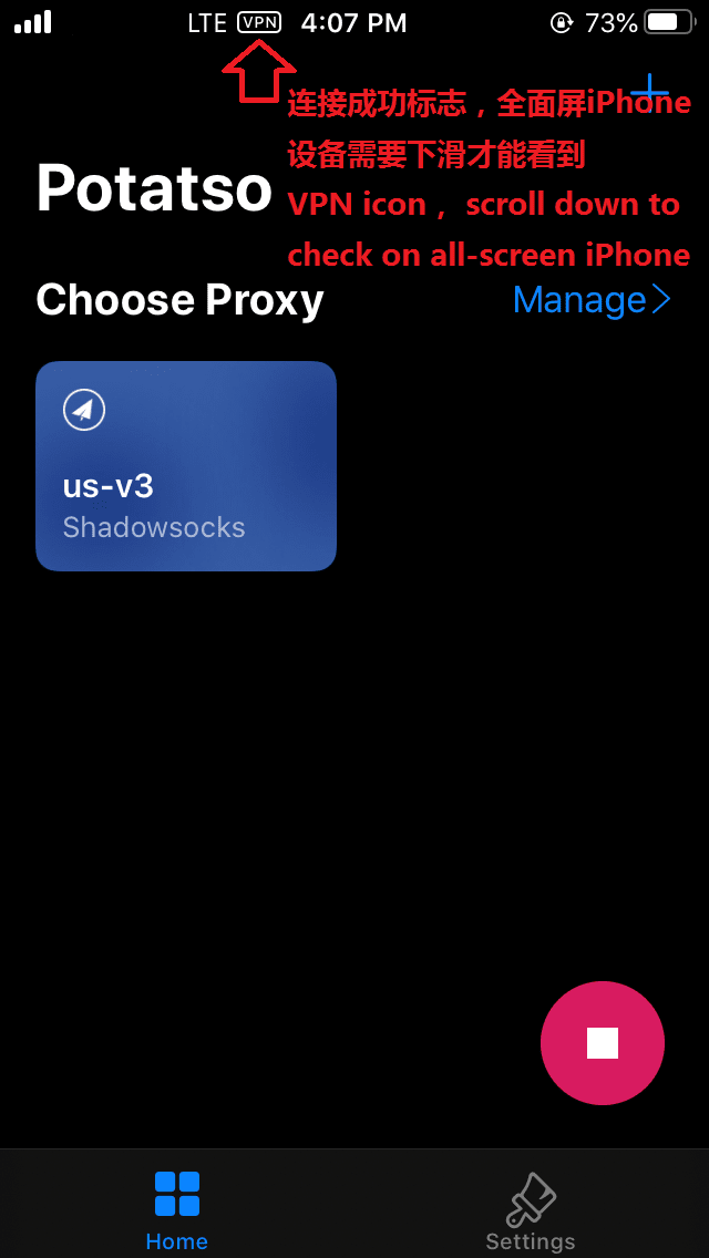 Step 4: Please first Enable Smart Routing, and then choose a server from Proxy, and then click Start to connect. you would see vpn icon on status bar(iPhone X has no vpn icon due to limited space). open safari and try to connect google.com, if you can open it, it means all is good now.